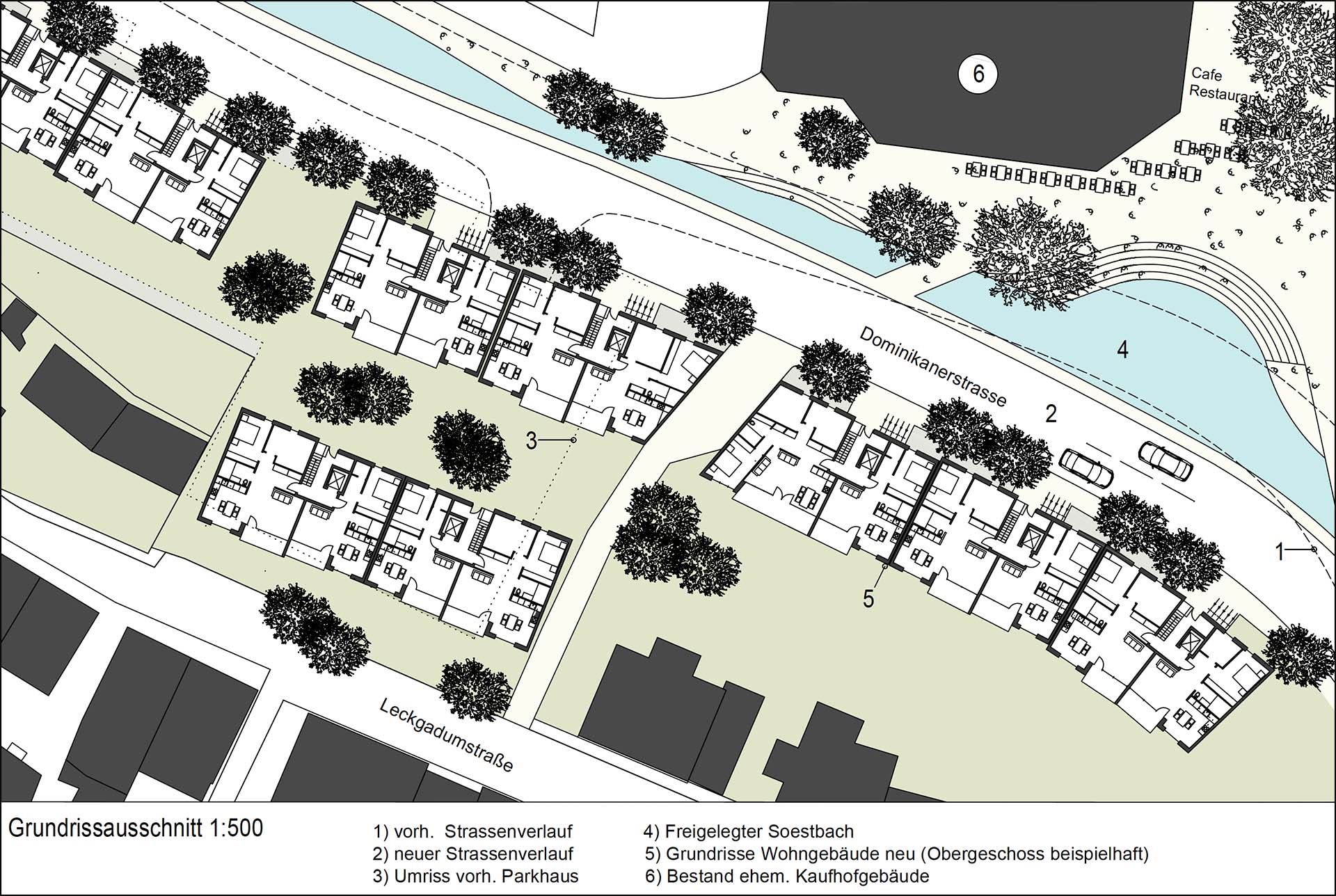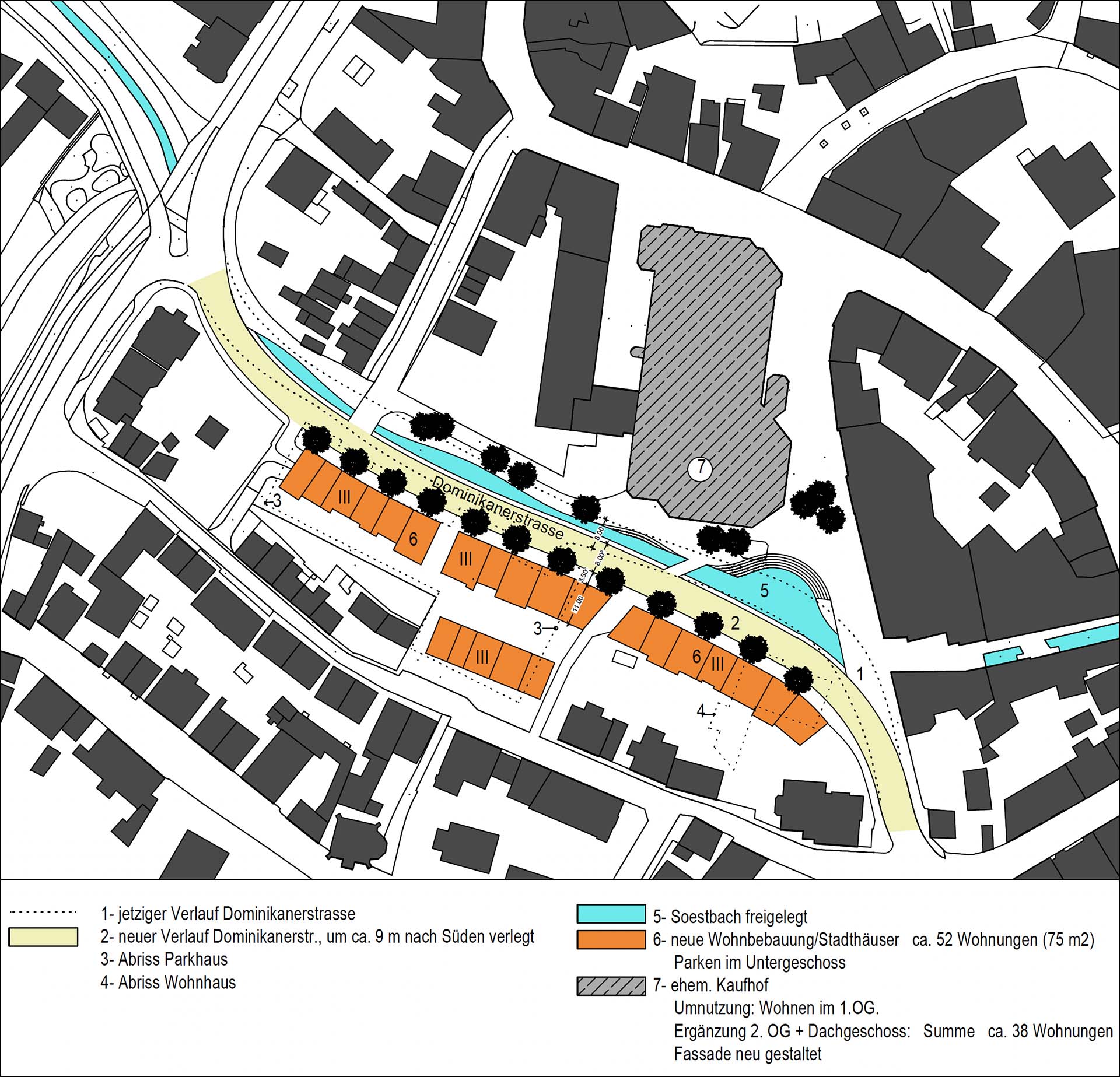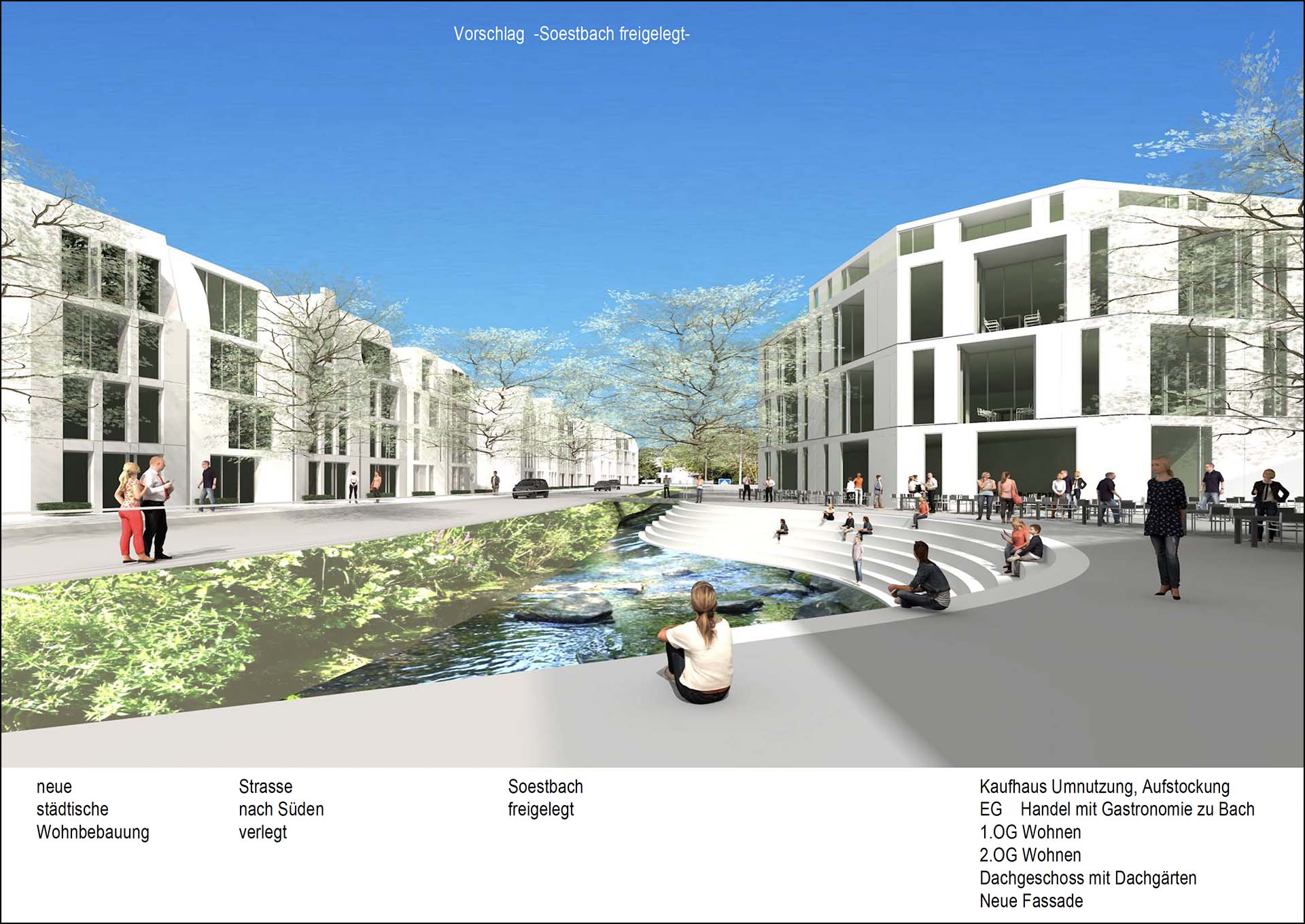 Da der offene natürlicher Verlauf des Soestbach das Bild der historischen Innenstadt stark prägt und er nur an dieser Stelle gedeckelt und verschwunden ist, schlagen wir folgende Maßnahmen vor, um diesen „Lost Place“ wieder in einen urbanen, städtischen Innenstadtbereich zu wandeln.